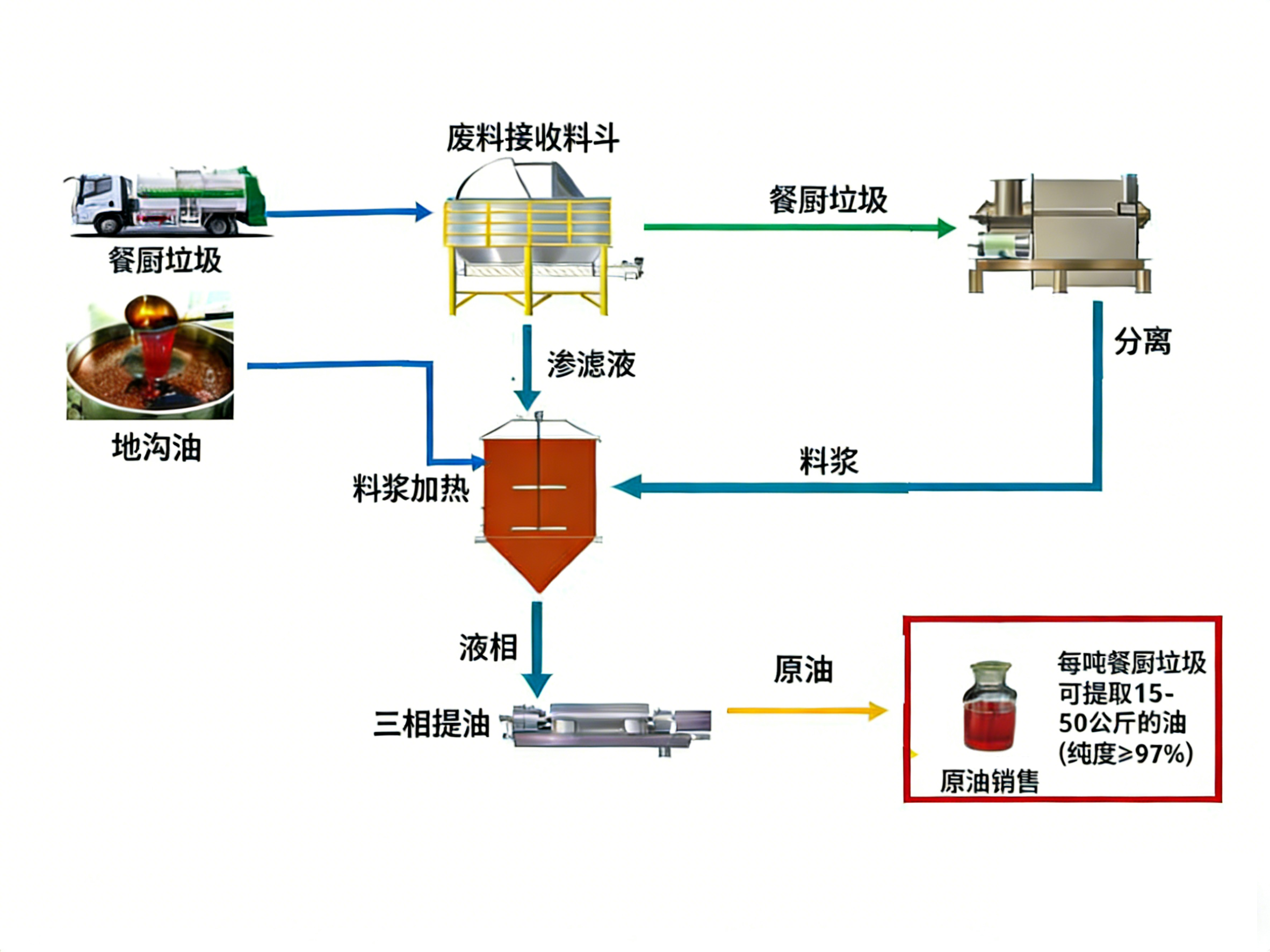 通过先进的油提取工艺,我们能从餐厨垃圾中回收超过90%的废油,每吨垃圾可提取15-50公斤纯度≥97%的UCO。